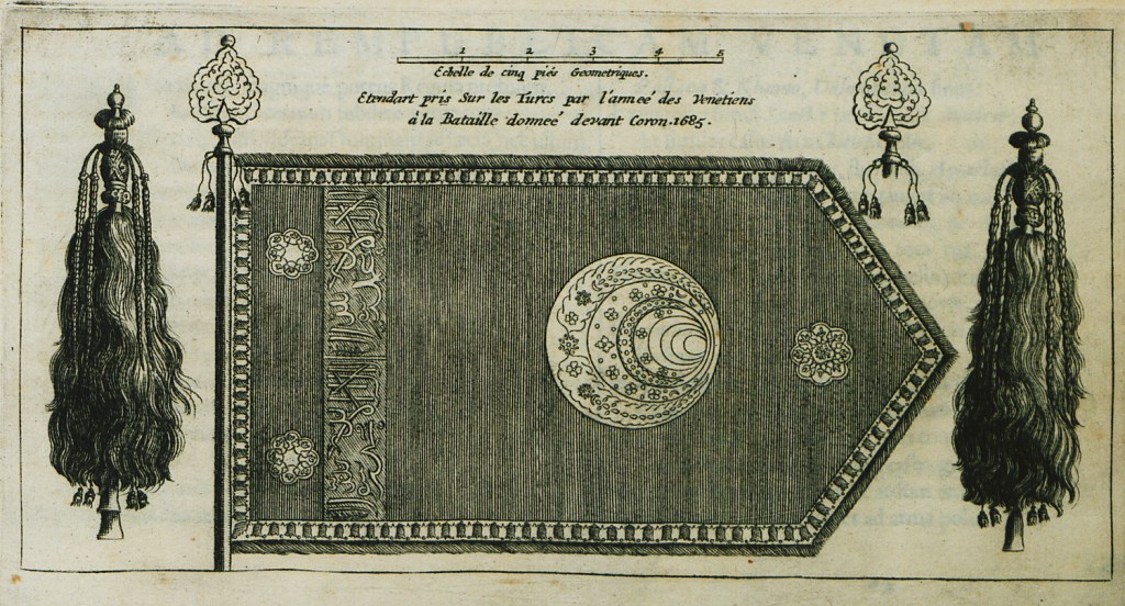 Jacob Peeters(1637–1695)於 17 世紀末在安特衛普(Antwerp)出版的著作插圖,表現了奧斯曼帝國軍旗的樣子。該書是研究 17 世紀地中海東部、巴爾幹半島及奧斯曼帝國視覺史的重要著作。圖片來源:https://el.travelogues.gr/collection.php?view=375