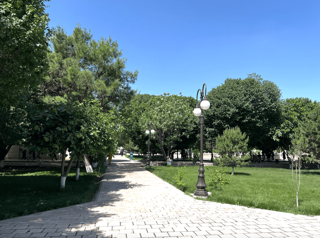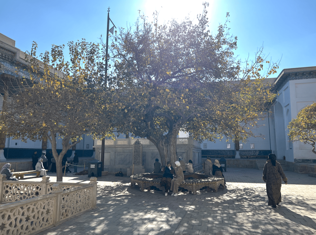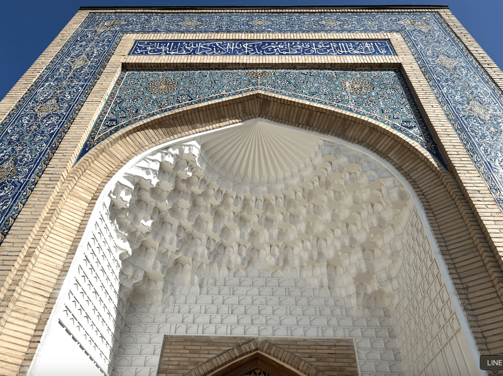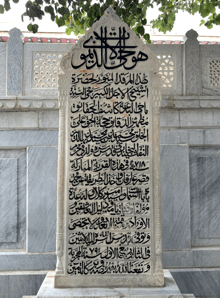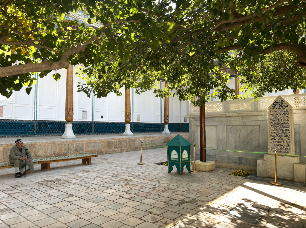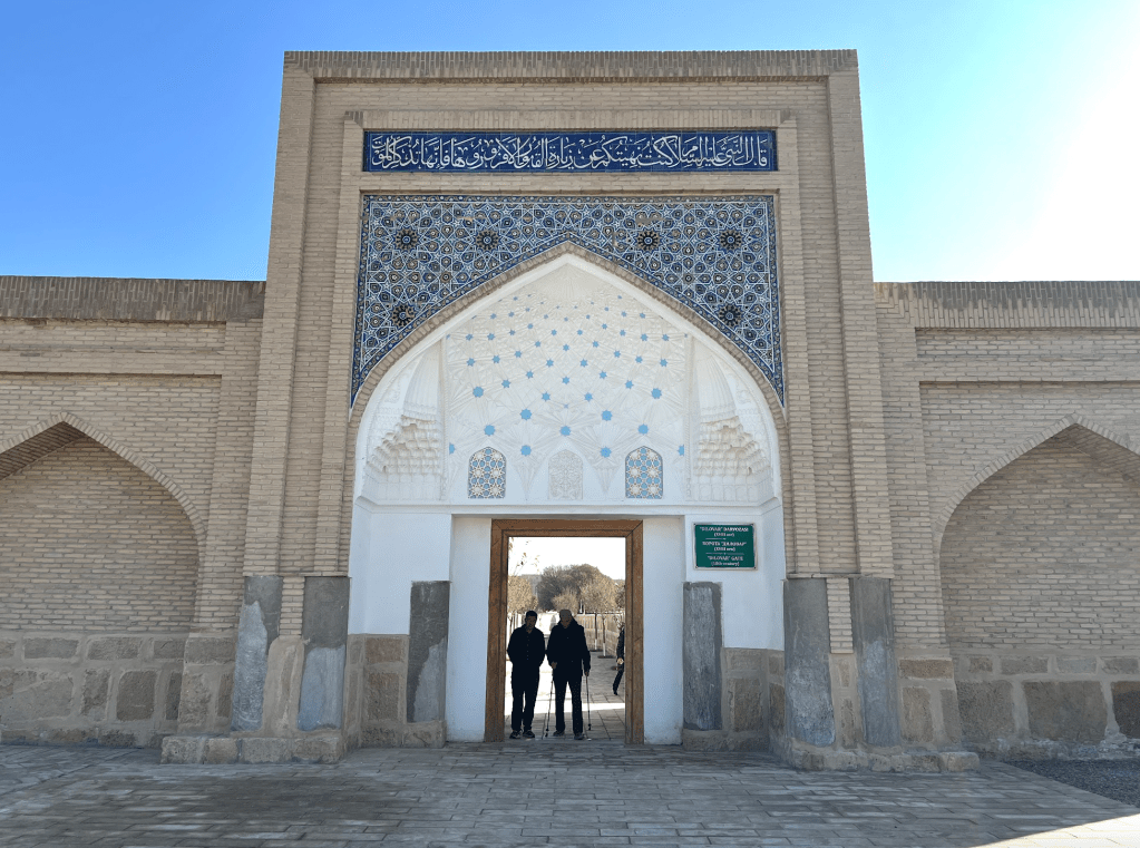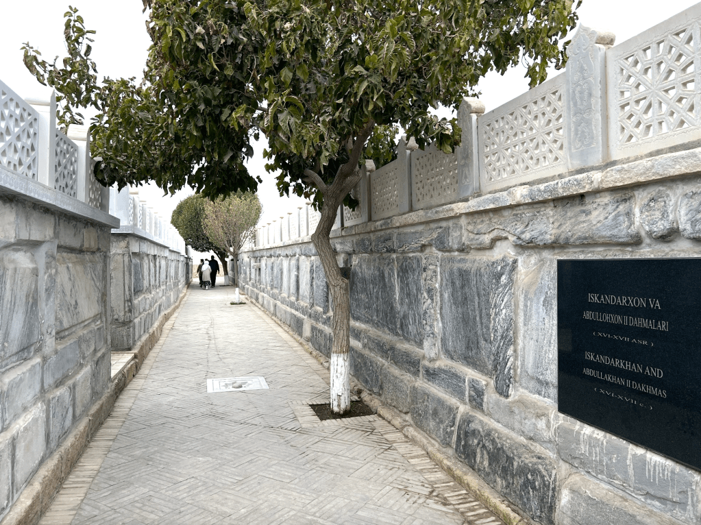 從這個高大的「伊斯蘭門」進入之後,所通向的,是一片長長的走道,沿途綠意盎然,心情也隨之而安定下來。在伊斯蘭世界中,一個建築物的入口,和核心功能的地點往往會保持一段距離,在這段距離裡,用花園、建築和光照,來營造一種心靈上的準備。在這裡,沿線的牆上是導師的介紹和一些訓誡之語的烏茲別克語和英語翻譯。道路最前方有一亭,前來走墳的穆斯林會聚集在此,由阿訇念誦《古蘭經》的段落和接dua(祈禱)。在這裡的旁邊,是一片昔班尼王朝的皇親貴族的墓地。按說,和卓·納格什班迪是14世紀,也就是帖木兒王朝時的人。他師承的是穆罕默德·巴巴·薩瑪西(Muhammad Baba al-Sammasi)和賽義德·埃米爾·庫拉勒(Sayyid Amir Kulal),這後者也是帖木兒父親的老師。英國劍橋的伊斯蘭學者,謝赫阿布杜·哈吉姆·穆拉德(提摩西·溫特)在一個「黃金鏈條上的七環」的短片中講述了這些鏈條上的老師們的故事和師承關係。十分值得觀看體會。(https://www.youtube.com/watch?v=QpJud3mfNmI&t=93s)