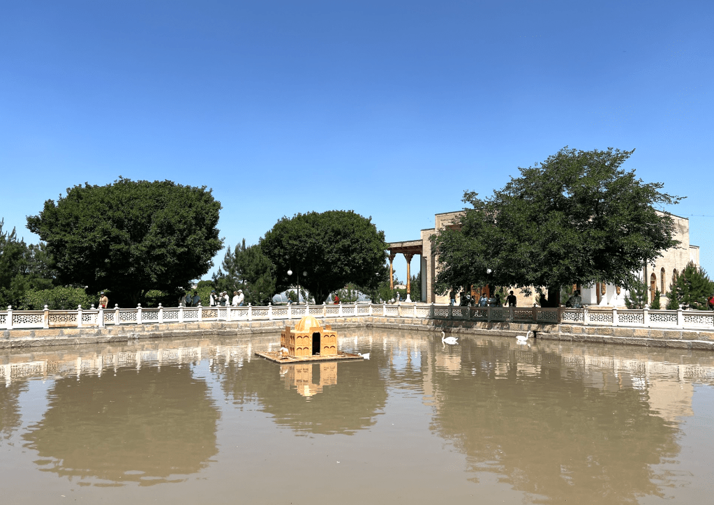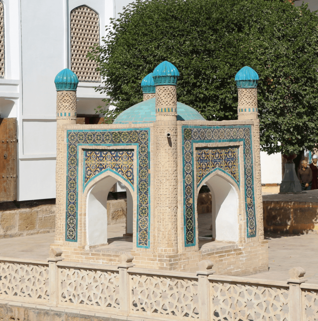 在墓碑對面的水池旁,另有一處值得一看的東西。它是一個色彩斑斕的小亭子,上面貼有五彩繽紛的彩色瓷磚。這是一個「冷飲亭」,soqkhana,soq就是「供水人」,khana就是「屋子」,這裡是供舉意給來訪的賓客們提供冷飲的人使用的設施。具體來說,就是有人想要做做善事,出散些錢財,就買來一些冰酸奶之類的消暑飲料,放在裡面,送給路過的人享用。這亭子的頂不只是裝飾性的,它可以遮陽。它下面是一個凹陷的石盆,在中亞乾爽的氣候下,只要有遮蔭和這厚厚的冰涼大石頭鎮著,是可以讓飲料保持一陣子冰爽的。