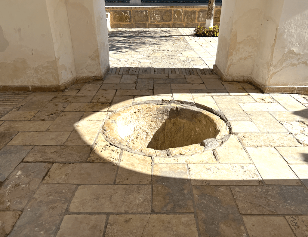 走出靜室,院子中間是一棵大樹,大樹旁邊的是水池、座位,以及大師的墓碑,常有來遊墳的人來這裡坐在椅子上做dua。