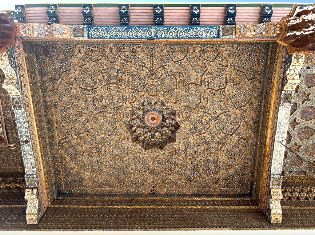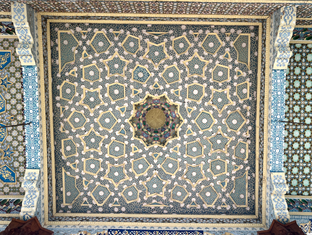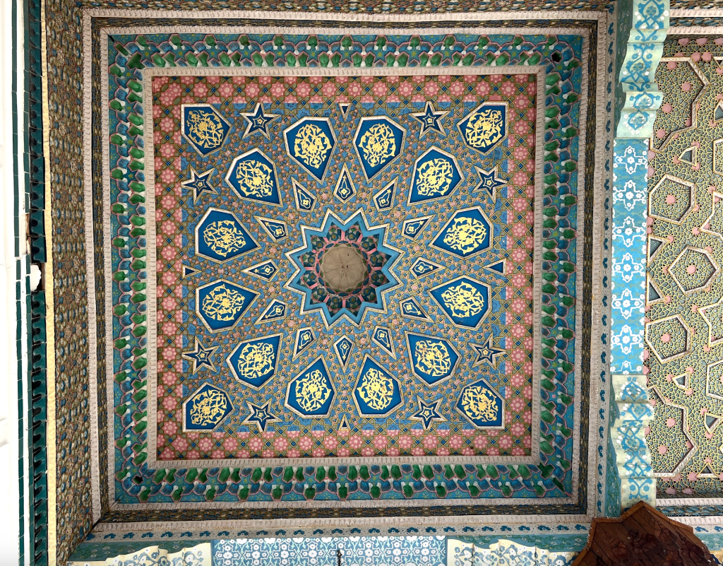 一般的遊人常常錯過這裡。因為它樸素、不起眼。然而這恰恰是它迷人的地方。欣賞伊斯蘭藝術的人,往往會發現靜室與禮拜大殿之間會有很鮮明的對比。靜室通常小且侷促,甚至常常是能容納單人靜坐的狹窄隔間或隱密地窖。為了徹底隔絕外界喧囂的干擾,室內往往不設窗戶,導致光影極其稀微幽暗。在這座墓園裡的靜室,雖然沒有那麼小,但是比起周圍的建築,它依然很不起眼。我輕手輕腳地開門,走進去,有遊人在此禮拜。環顧四周,沒有繁複的花樣,僅有素淨的抹灰牆面。這種近乎絕對的虛空本身也是藝術表達,因為靜室本身就是排開外在紛擾,清空內心,封齋、坐靜、禮拜的地方。唯一有繁複裝飾的,在屋頂上,它故意把視覺吸引到那,因為它的中心留有一孔,一束光照進幽暗的靜室,隱喻真主的指引之光。