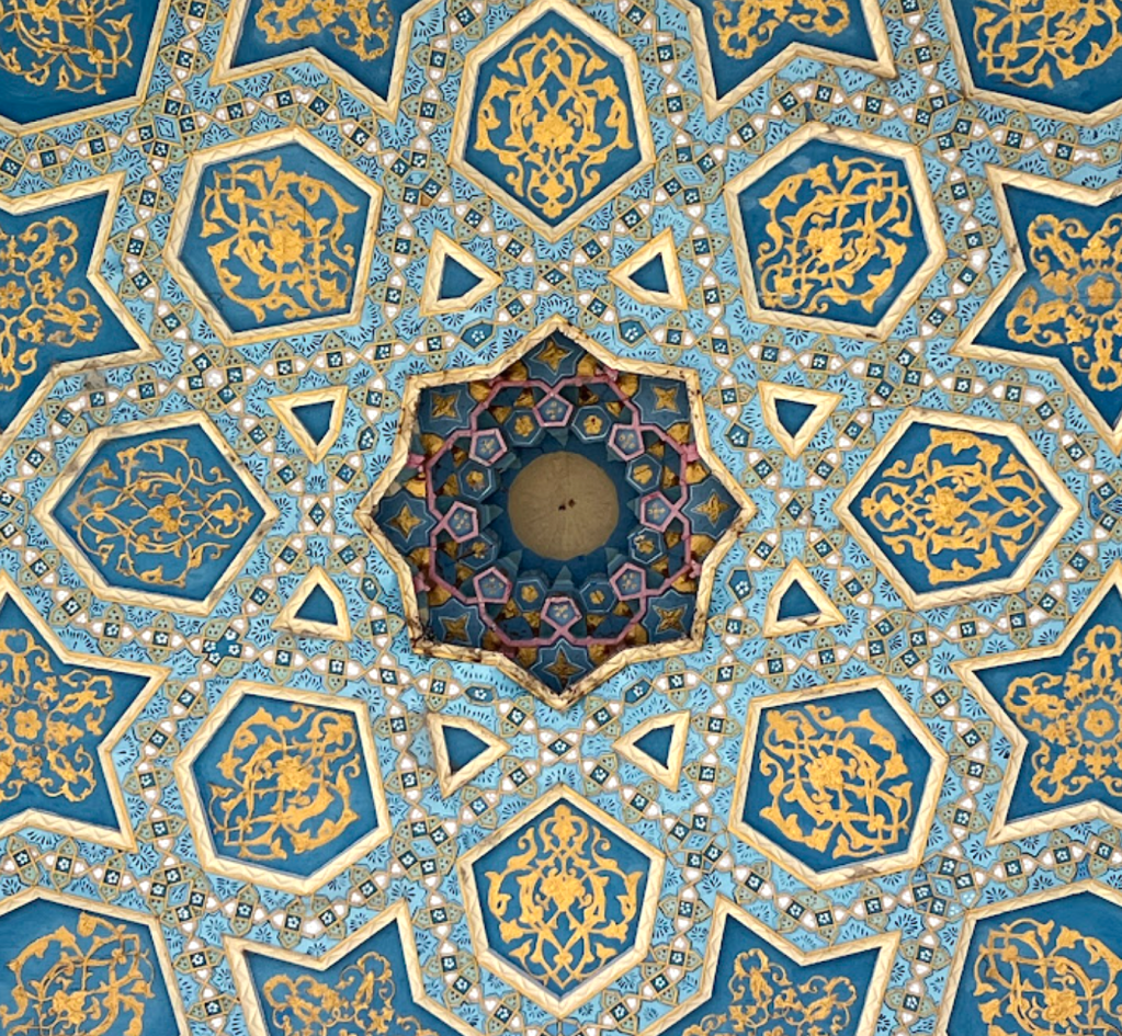 一般的遊客和走墳者,都是從靠在大馬路旁邊的「伊斯蘭門」進入。這座門上方有星羅棋布內凹的白色石膏穆卡爾納斯(muqarnas),把我的目光引向上方。在伊宛入口(iwan)頂處,閃閃發亮的瓷磚書法帶上寫著《古蘭經》(13:28)裡的句子:
