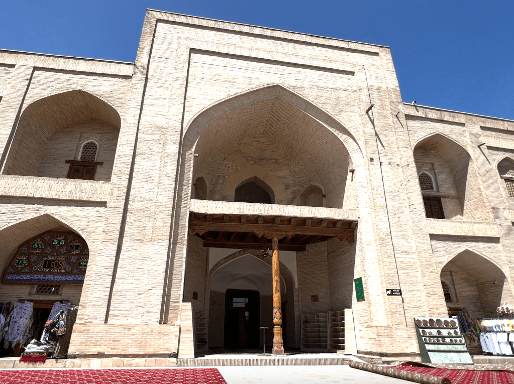 在這個院落的兩側,都有清真寺,如今作為男寺和女寺使用。今天的男寺建於19世紀,女寺建於18世纪,名叫Abdul Hakim Qushbegi Masjidi。對比這兩座清真寺的內部裝潢,19世紀的一座十分簡樸,18世紀的一座則有繁複美麗的天花板,想必也反映出布哈拉埃米爾國在19世紀時已行將就木,財力已經大不如昔日了吧。